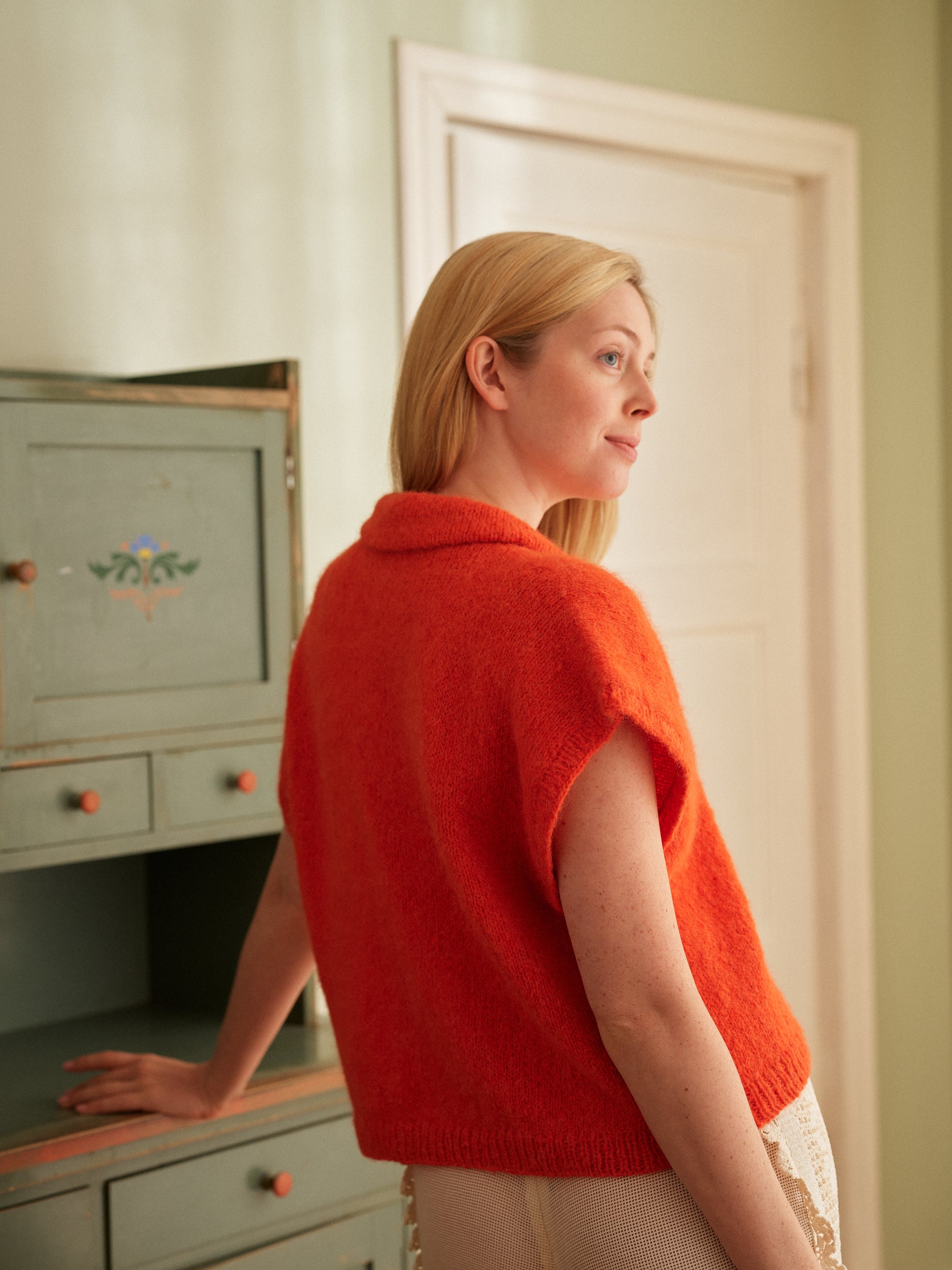Sara Markkula’s Isabell sweater is worked in brioche stitch, with a single strand of silk-mohair yarn and large needles. This combination requires some patience, but the result is a lovely, fluffy sweater that feels as light as a feather. The double-knitted V-neckline adds structure and stands out as a unique detail in an otherwise simple piece. The sweater is knitted from the top down. Sara recommends using metal needles and intentionally loosening your grip.
