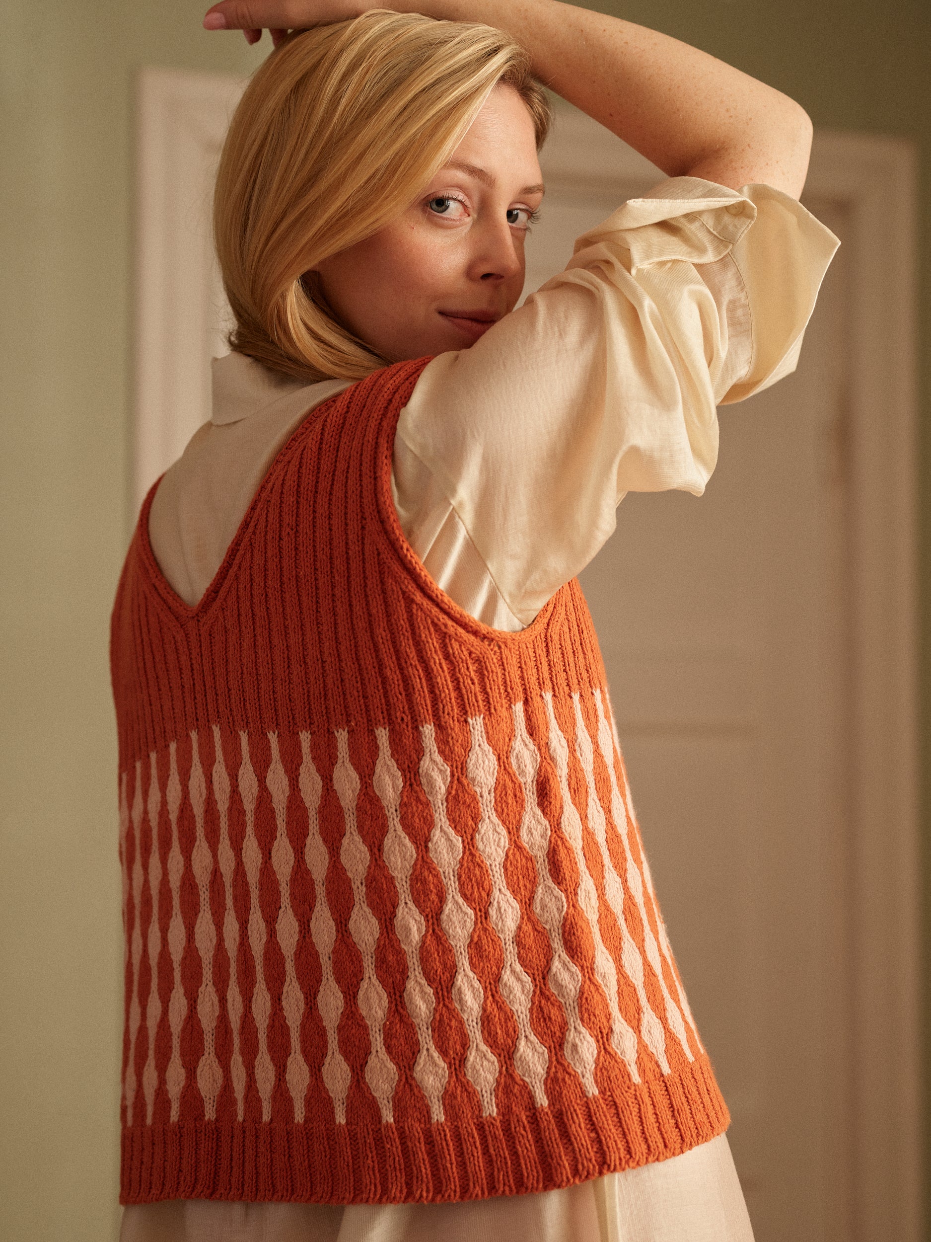 The inspiration for Sari Nordlund’s Shell Song pattern came from the sea’s quiet rhythm. Sari wanted to create a summer knit that felt light and flowing, something that echoed the soft curves and textures of seashells and ocean waves. Shell Song is worked seamlessly from the top down, featuring a lace and cable pattern on the front and sleeves. It has a relaxed, boxy fit with dropped shoulders, giving it a casual yet elegant silhouette. The stitch pattern is rhythmic once you get into it, which makes the tee enjoyable to knit.