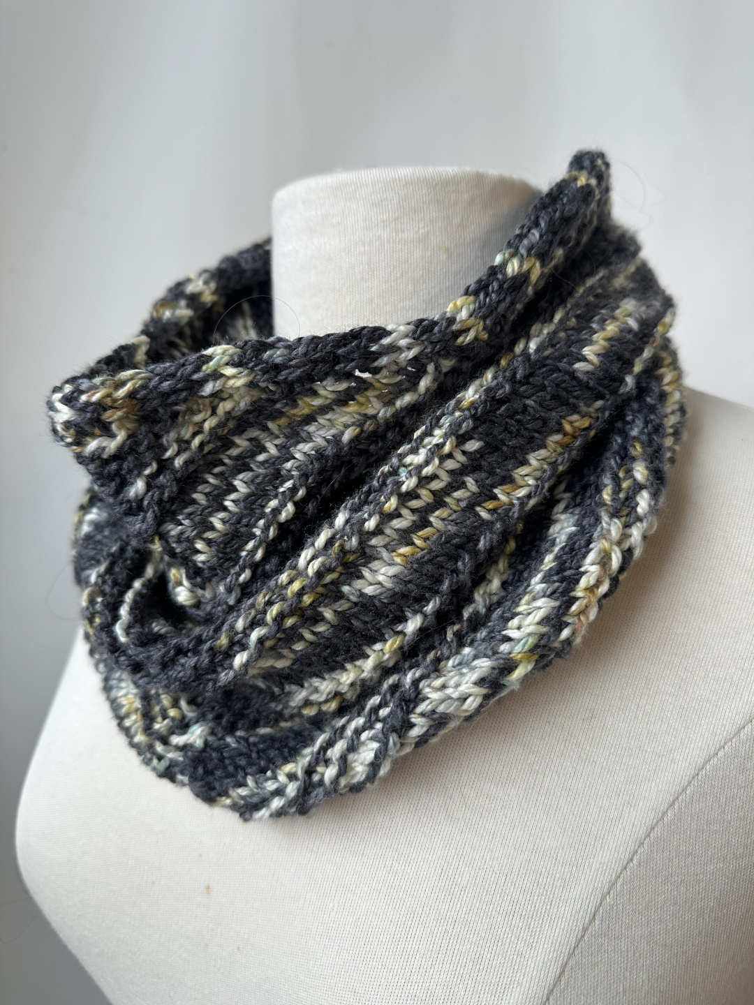 2. Snug Diagonal Cowl by Iris Schreier: 1 skein of Silky Twist. It's a quick knit that uses its diagonal design to help keep its structure and stay upright.