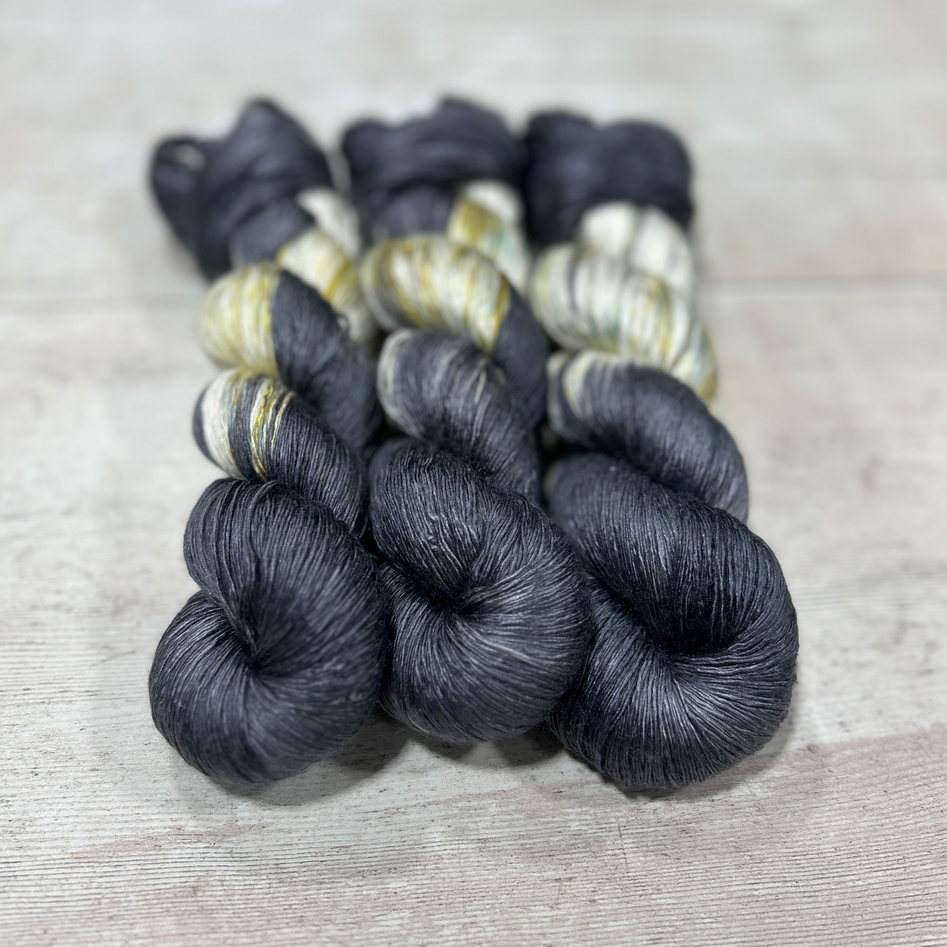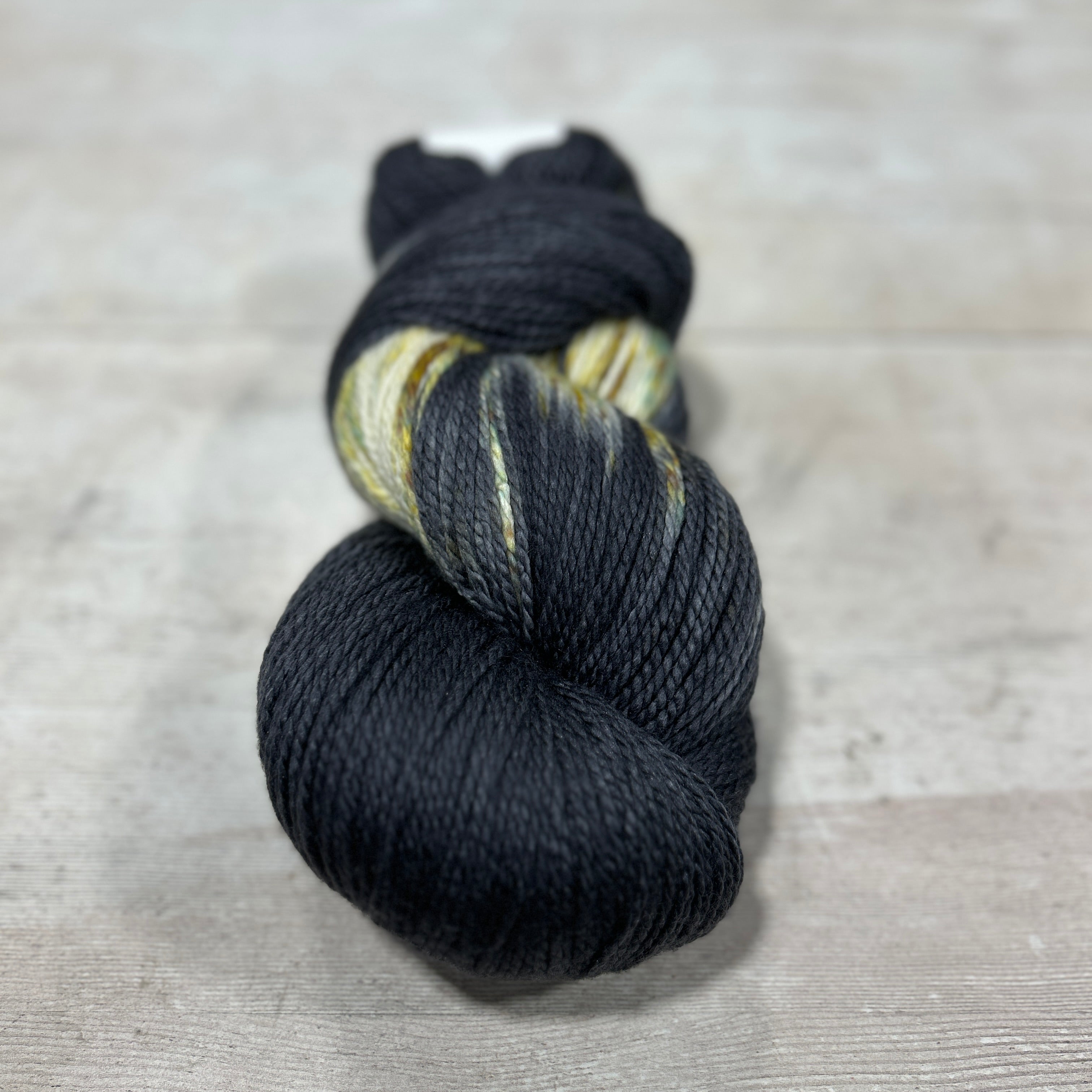 "Ring in the new year with an exotic black with gold speckled yarn color."