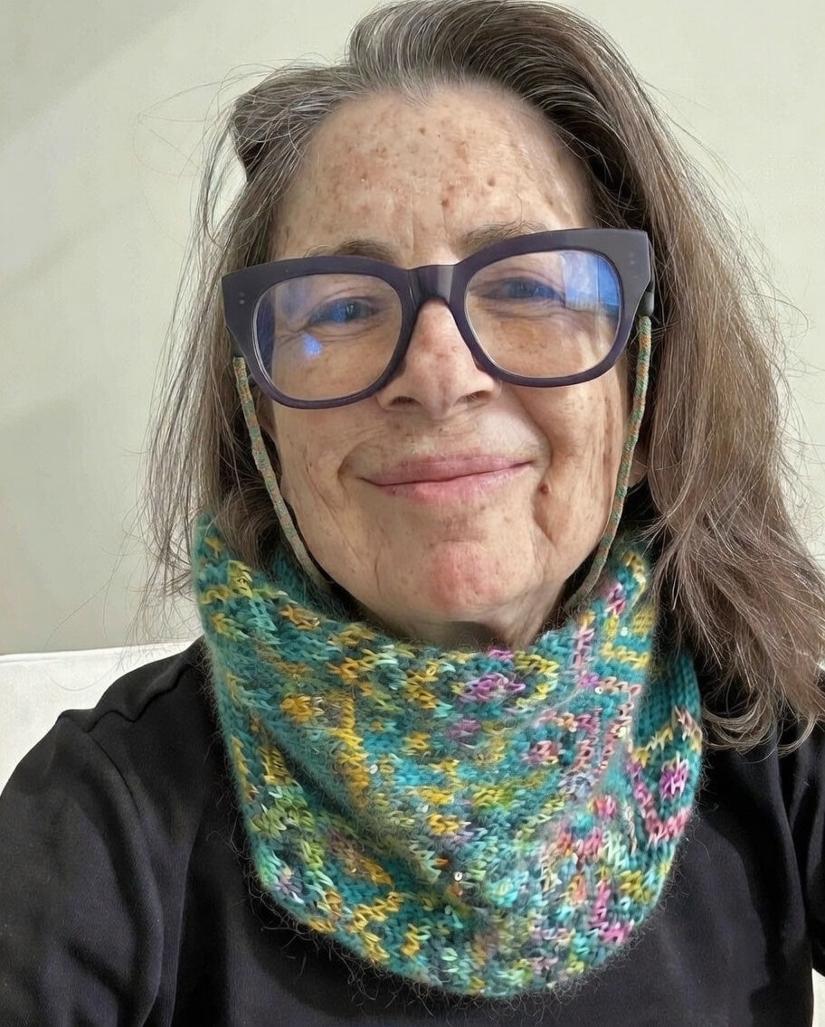 2. Joshua Palm Cowl by Iris Schreier: 1 skein of Merino Cloud + 1 skein of Beaded Silk & Sequins