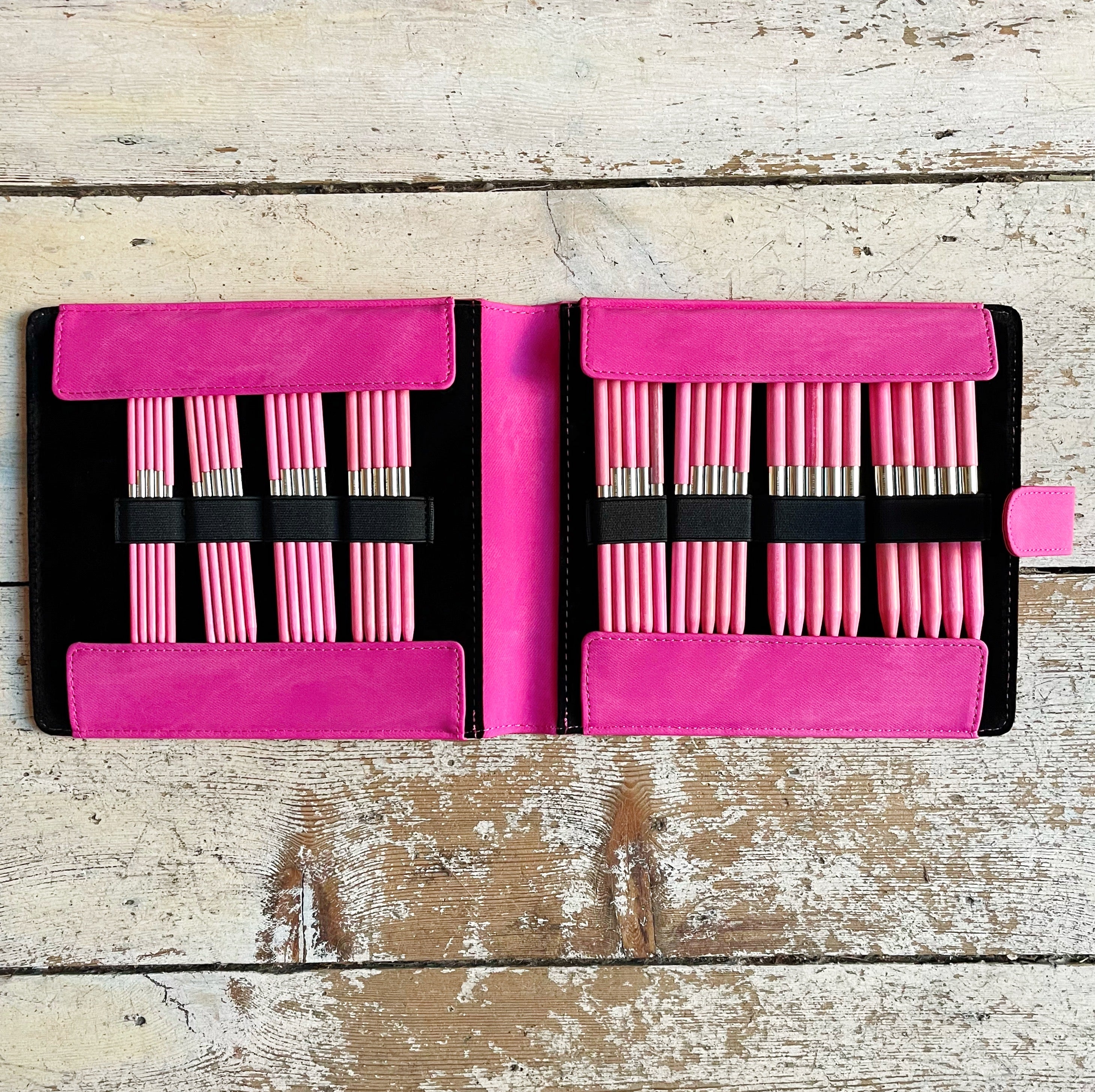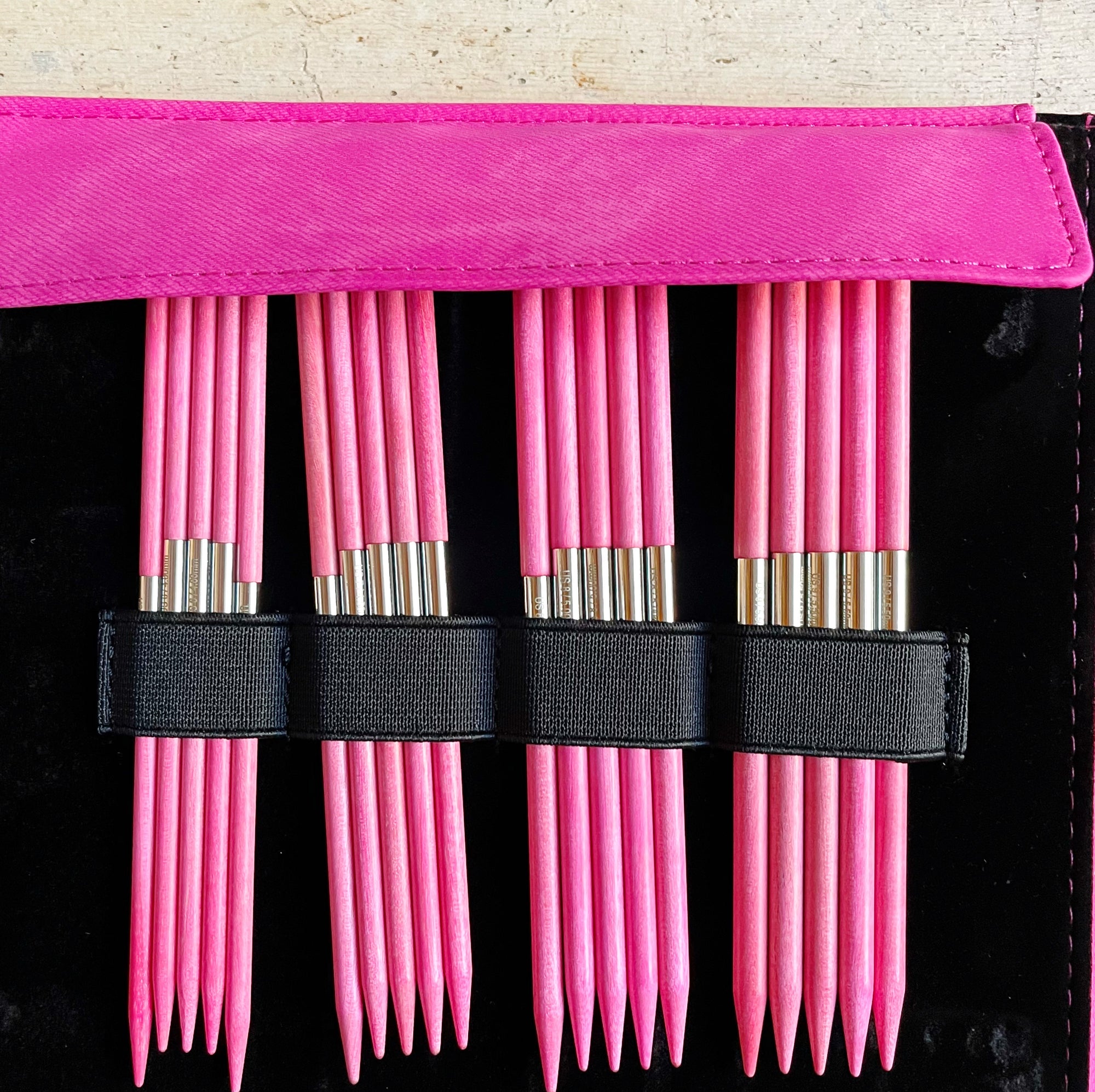 This set includes 8 sets of 6" dpns (4mm, 4.5mm, 5mm, 5.5mm, 6mm, 6.5mm, 8mm, 9mm. All sizes feature the signature silver-metal cuff in the middle of the needles.