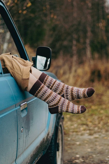 The book has designs for everyone in the family, and a variety of techniques from intricate colourwork and cables to elegantly simple stitches. Inspired by nature, shared moments, and the joy of travel, these patterns invite you on an adventure – whether to unexplored side paths or the peace of a log cabin.