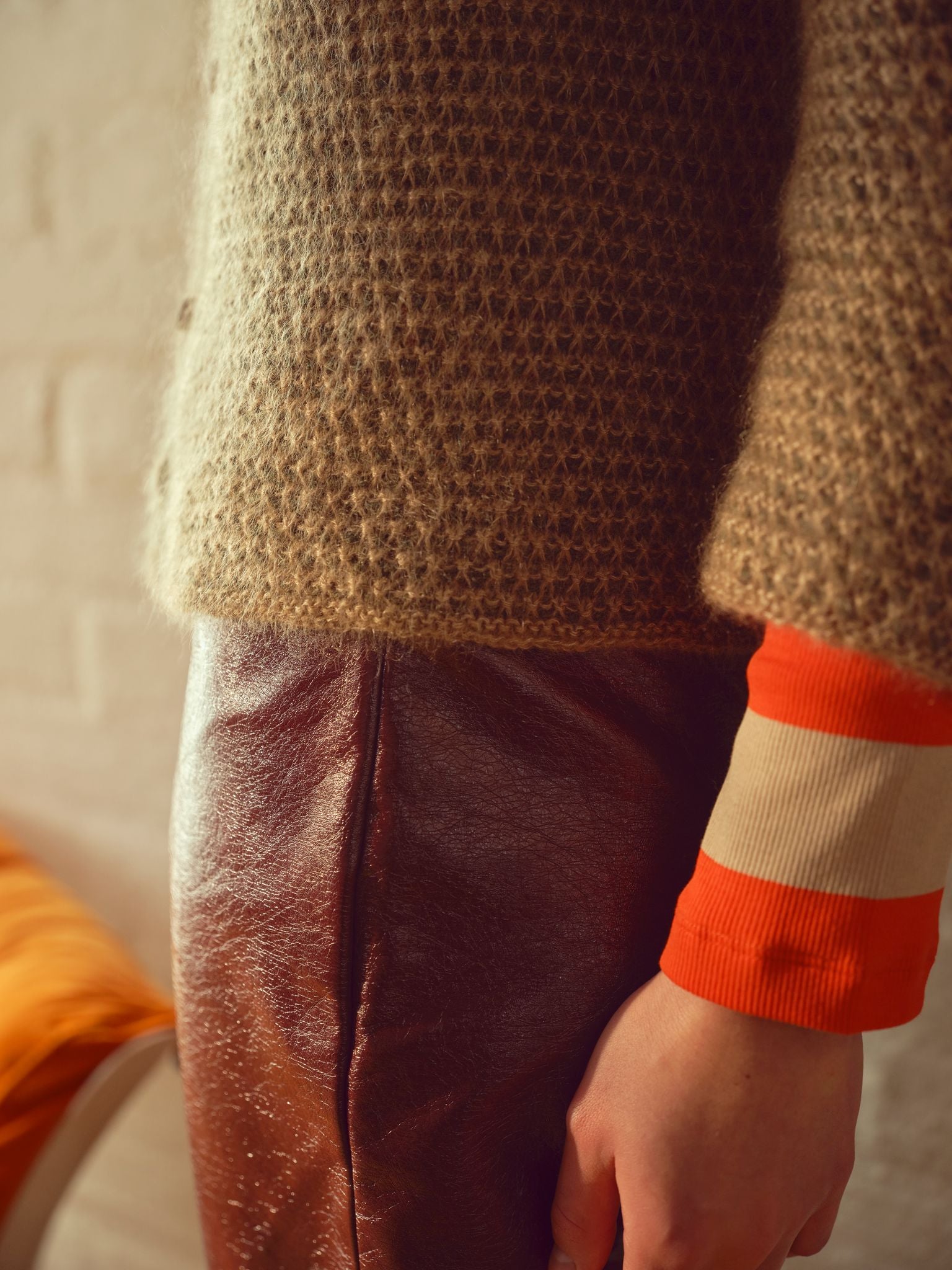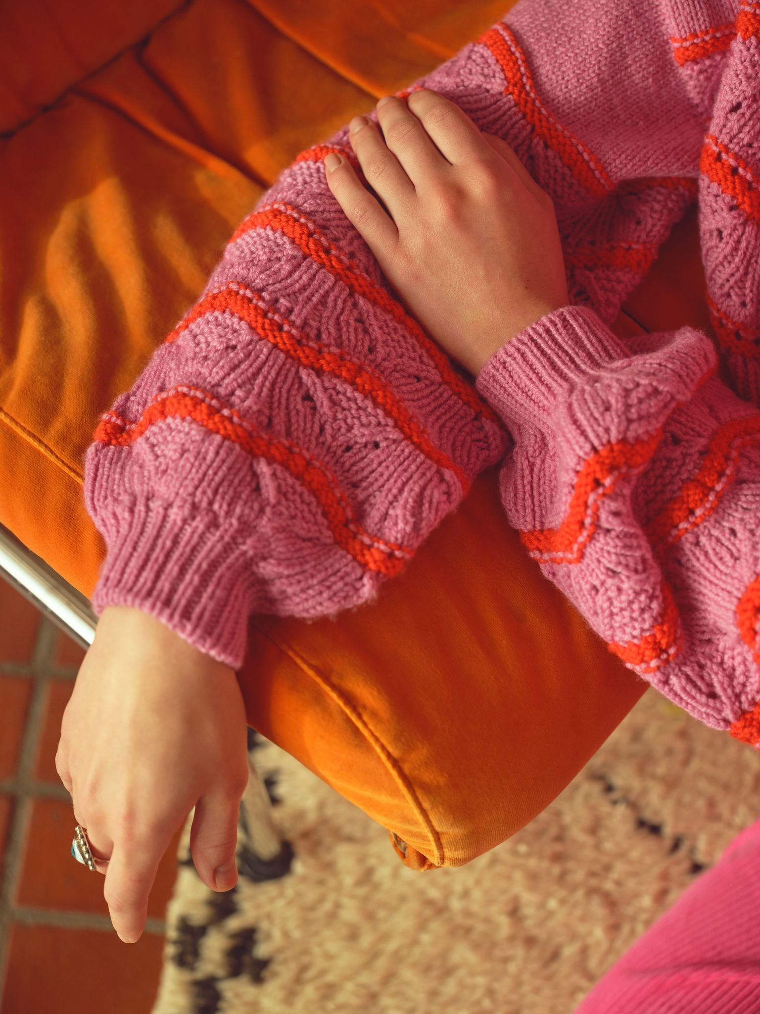 Seashells is worked from the top down flat and in the rnd. It features an intuitive, straightforward construction to enhance the textured ribbed pattern of the fabric and the decorative crochet edges at the neckline and armholes. This design is inspired by happy sunny days at the beach and combines the vibrant colour of the sun with sea creatures (intricate details of the Plaited Rib pattern and scalloped crochet edge).
