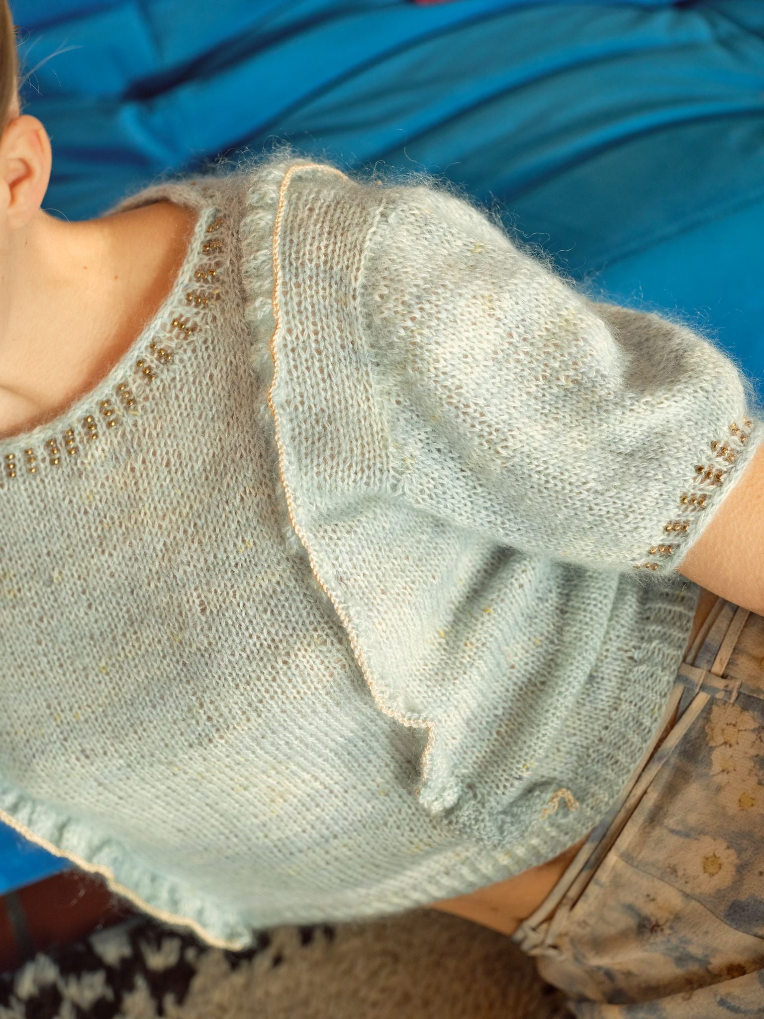 Liberty is a light-weight sweater for carefree summer days. It features delicate ruffles on the body, beads on the neckline and cuffs, golden thread along the ruffle edges and puff sleeves.