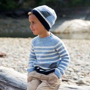 Fanciful and fun to knit, the Fin Sweater & Hat set features classic sailor stripes with a fun Intarsia shark’s fin added to create a playful, go-anywhere raglan sweater. Knit in our incredibly snuggly Washable Wool dk for a soft, machine-washable set they’ll want to wear on and offshore