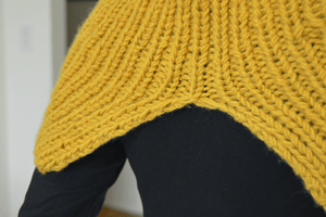 An oversized cowl that has a unique slit to add a chic style to a typical neckwarmer. Yarn is doubled for a chunky look, that will take you no time to make! Knit the matching Gold Street Hat!
