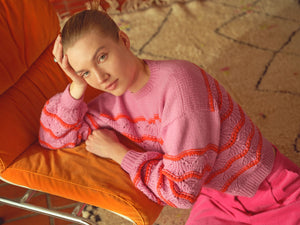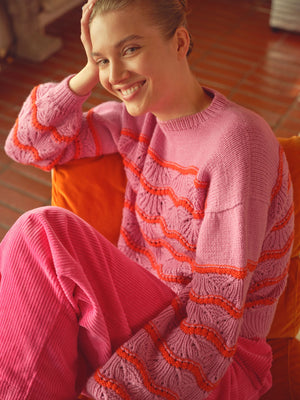 Seashells is worked from the top down flat and in the rnd. It features an intuitive, straightforward construction to enhance the textured ribbed pattern of the fabric and the decorative crochet edges at the neckline and armholes. This design is inspired by happy sunny days at the beach and combines the vibrant colour of the sun with sea creatures (intricate details of the Plaited Rib pattern and scalloped crochet edge).
