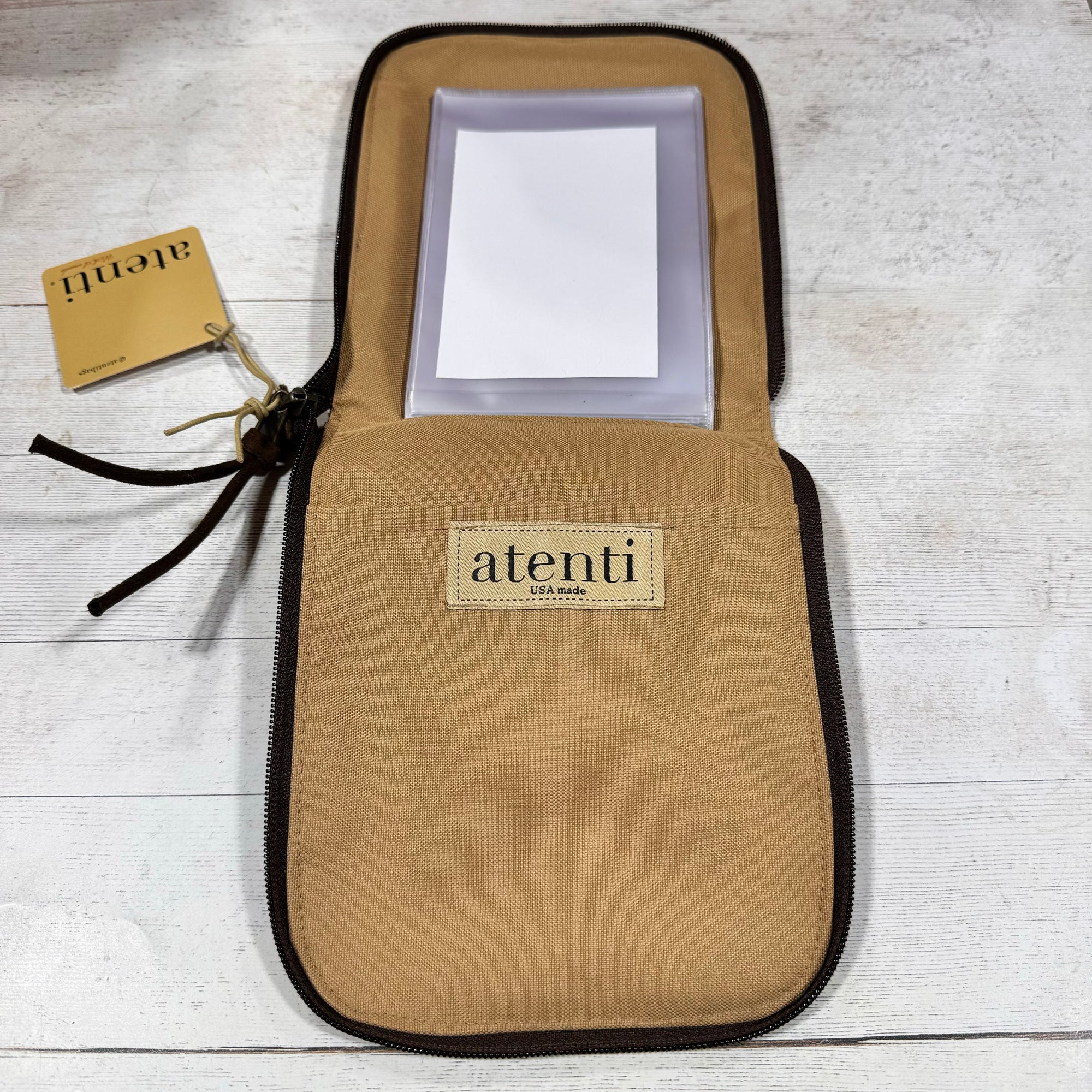 An all around zipper closure protects an interchangeable plastic booklet insert with 12 clear pockets.