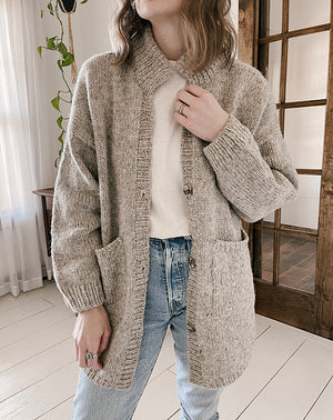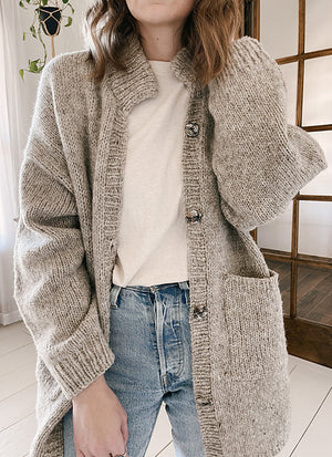 Worked from the top down, it features dropped shoulders and back shaping with minimal details at the shoulders for a classic shape. It is finished with a fold-over collar and a clever curved hem created by short rows. This oversized woollen shirt-jacket, designed to be worn almost any day of the year.