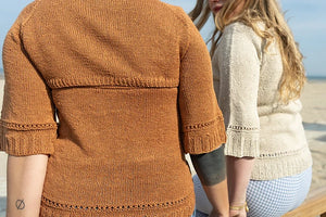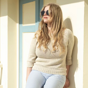• Designed by Lucienne Tricote, this clever pattern has one-piece or two-piece options, with pretty hem details and ¾ sleeves. Knit in gorgeous 100% Hemp - the fabric just gets better and better.