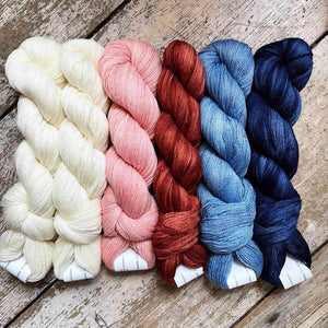 Dyed up especially for us by Artyarns in our favourite Merino Cloud (80% Fine Merino, 20% Italian Cashmere); the colourways have been chosen to really show off this incredible pattern which uses a palette of 4 colours and a neutral.