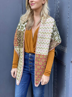 "A dream project for colourwork lovers, Scout’s patchwork effect is achieved by mixing Fair Isle and intarsia knitting throughout. Knitted sideways from tip-to-tip, the easy-to-wear shape and size of the shawl is designed to display maximum detail as it drapes over the shoulders." Florence Spurling