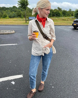 The smaller size Sophie Scarf wraps around the neck once, while the larger size can wrap around the neck twice.