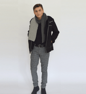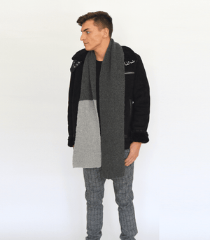 A unisex scarf with a "pop" of contrasting asymmetrical colour. Knit in the "greys" shown or choose two colours of your own!